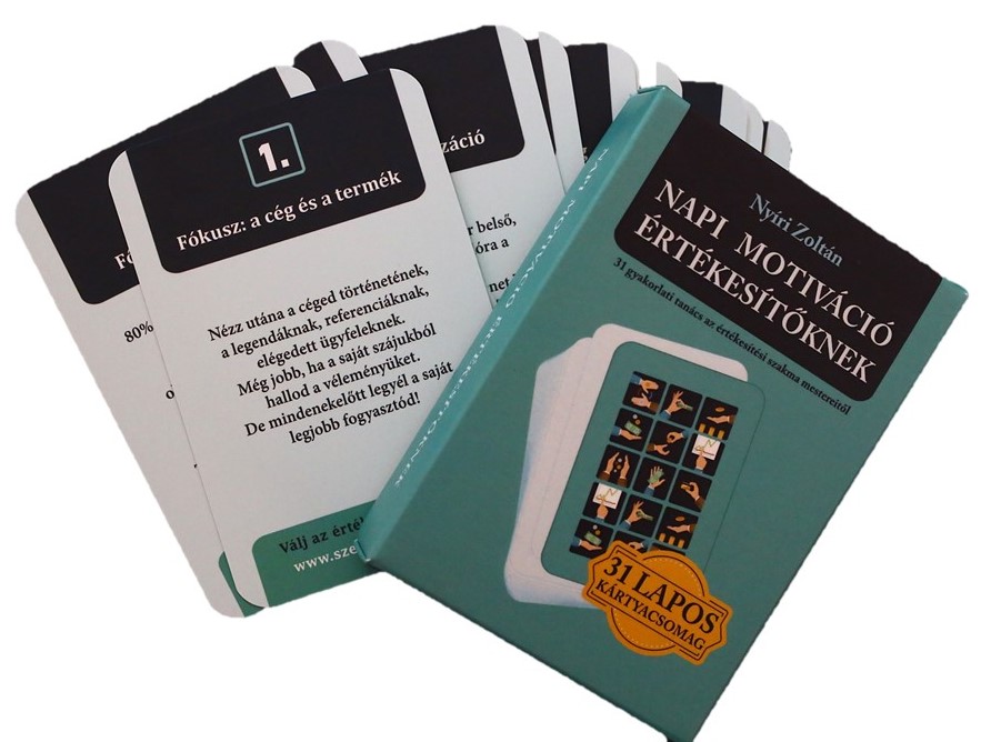 Ez a kártyacsomag egy „hogyan-bomba”: 31 rövid, ütős módszert tartalmaz az értékesítési készséged fejlesztésére. Használhatod többféleképpen is. Ha hiszel a vonzás törvényében, akkor hagyatkozz az érzéseidre: amikor iránymutatásra van szükséged, kérdezd meg: „Jelen pillanatban mit tehetnék, hogy még jobban menjen az értékesítés?”